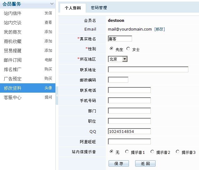 點擊會員服務(wù)->修改資料,打開修改頁: