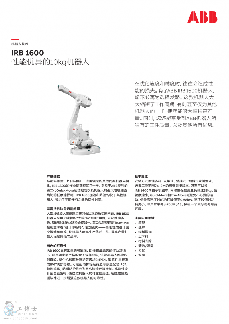 在優(yōu)化速度和精度時(shí),往往會(huì)造成性 能的損失。有了ABB IRB 1600機(jī)器人, 您不必再為選擇發(fā)愁。這款機(jī)器人大 大縮短了工作周期,有時(shí)甚至僅為其他 機(jī)器人的一半,使您能夠大幅提高產(chǎn) 量。同時(shí),您還能享受到ABB機(jī)器人所 **的工件質(zhì)量,以及其他所有優(yōu)勢(shì) 。