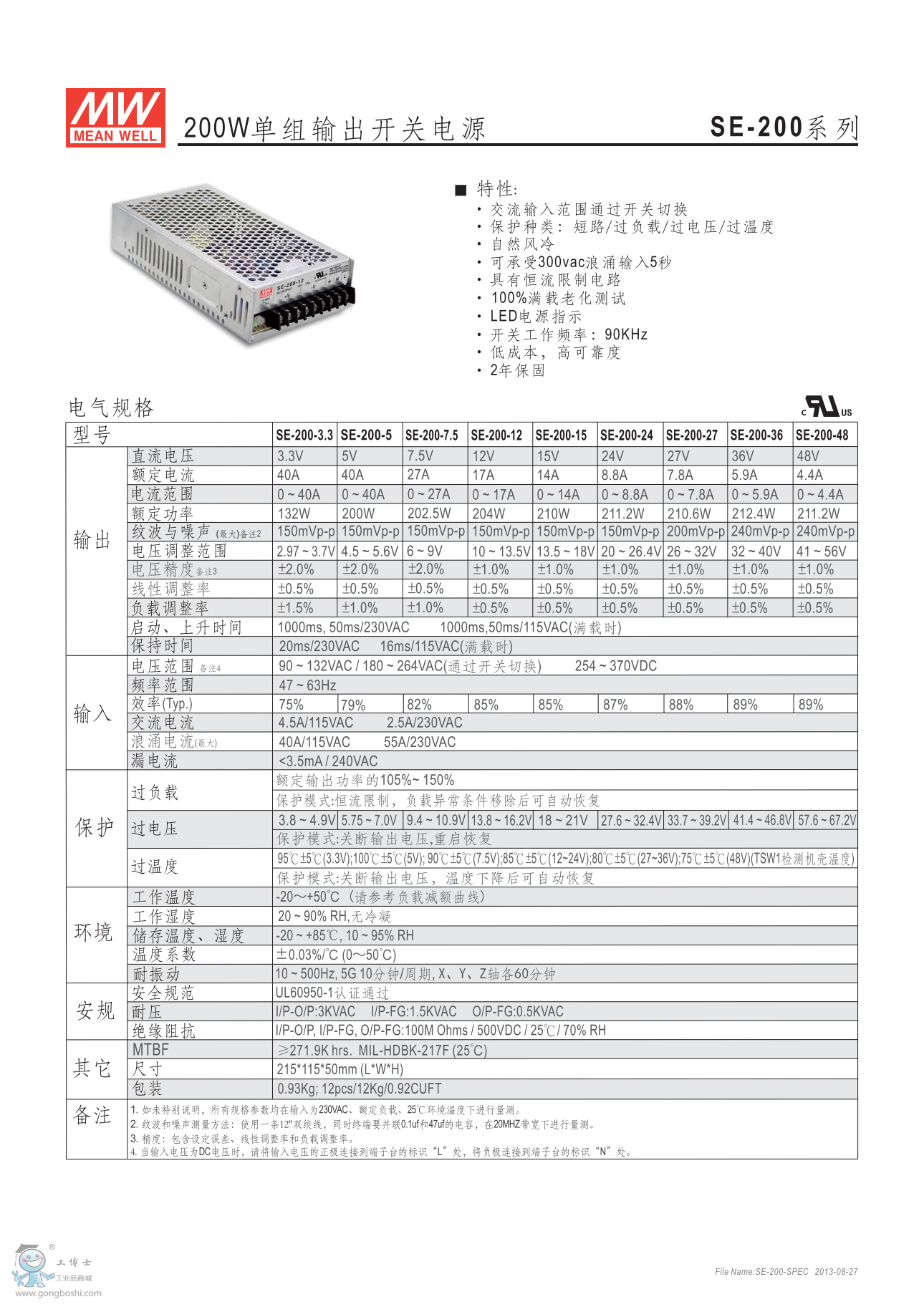 明緯SE-200-48 48V4.4A單組輸出開(kāi)關(guān)電源 |