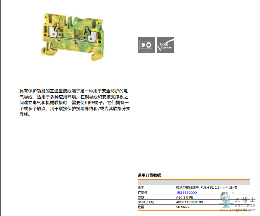 Weidmuller A2C 2.5 PE 魏德米勒 接地型接線端子 訂貨號1521680000 |
