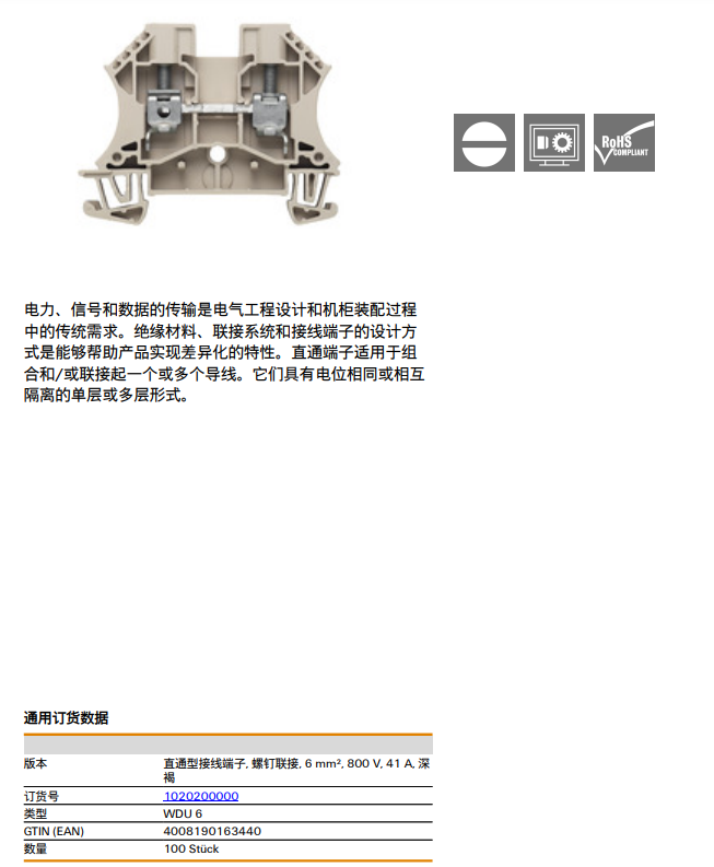 Weidmuller WDU 6 魏德米勒 直通型接線端子 訂貨號1020200000 |