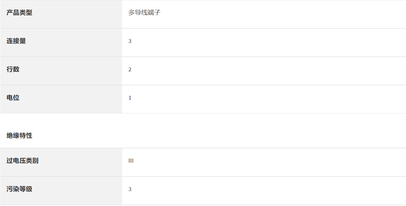 單側(cè)雙連接單層端子,接線容量: 0.2 - 4 mm2,AWG: 24 -12,厚度: 6.2 mm,顏色: 灰色