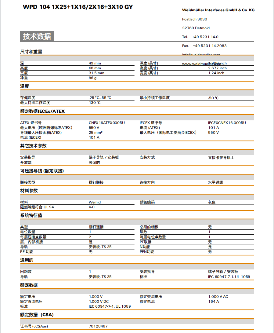 WPD 104 1X25+1X16/2X16+3X10 GY 魏德米勒 WPD 1XX配電塊 |